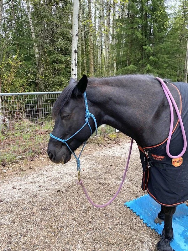 Xenia arrived to my place on thyroid medication, which is sometimes used to help horses lose weight when their condition becomes precarious. Since I’m not well-versed in this strategy, my goal was to wean her off the medication and with our veterinarian’s support, we did so over 3–4 weeks.